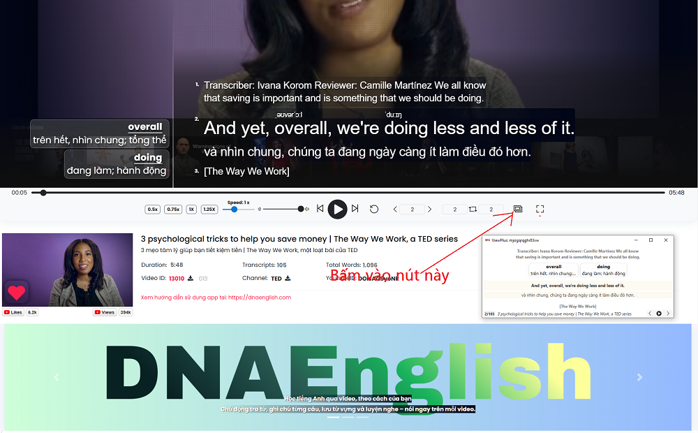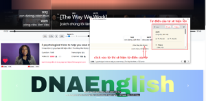 Bạn cũng có thể click vào từ tiếng Anh và tra từ điển giống như trong màn hình video chính.